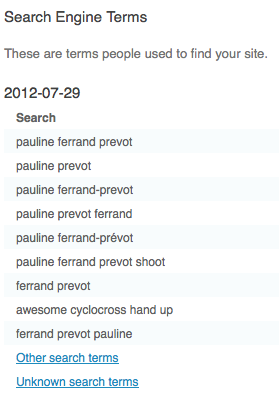 After looking at the search term referral data I found this:People don’t care about Adam Myerson… They care about Pauline Ferrand Prevot. I think Adam knew that when he answered question #4. Oh and by the way, they are mostly from European search engines.